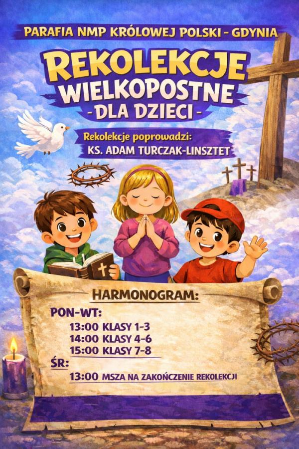 Rekolekcje parafialne dla dzieci szkół podstawowych: w poniedziałek, wtorek i środę.